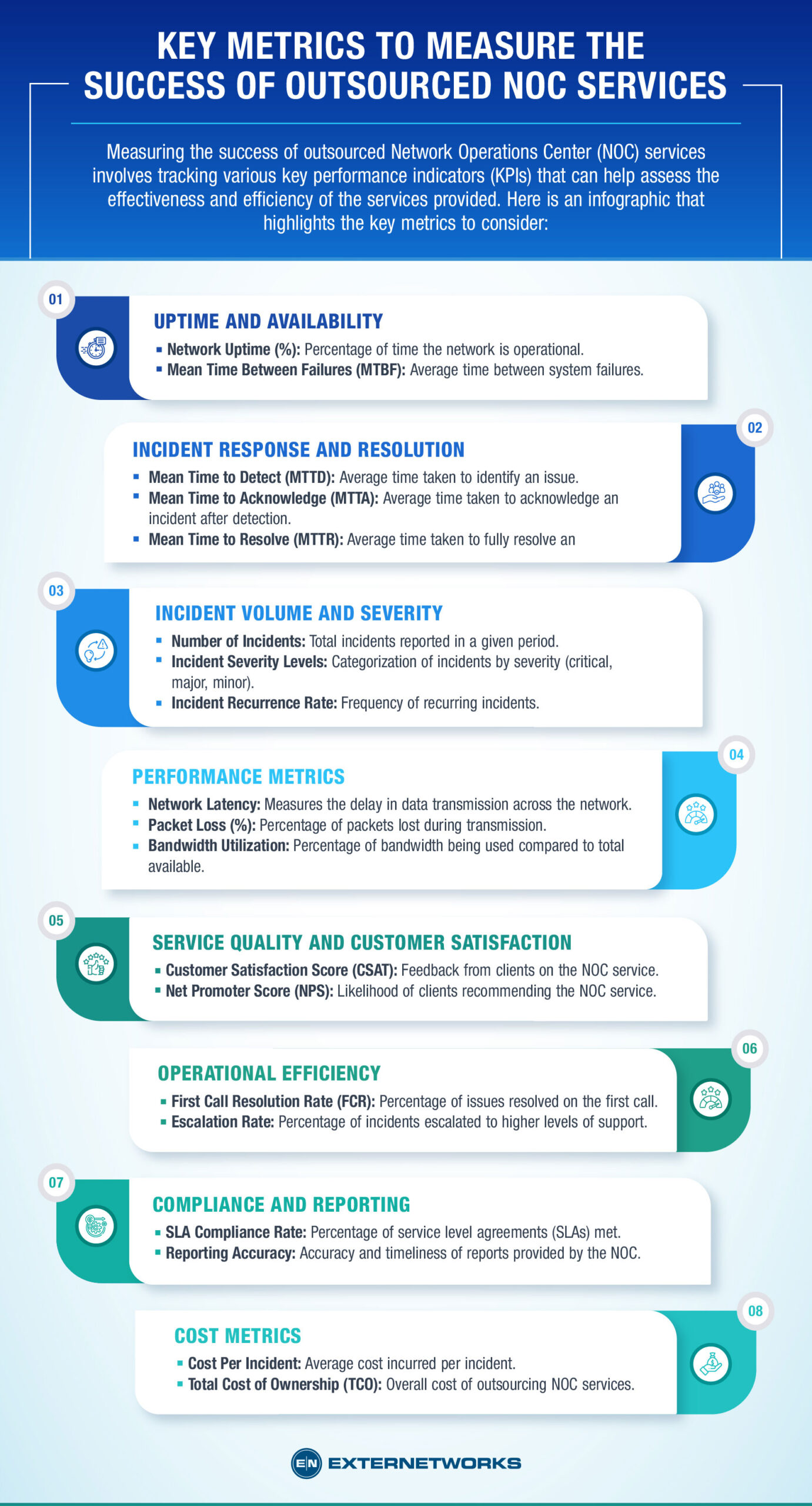 Measuring the success of outsourced NOC services involves a comprehensive approach that includes various performance, efficiency, and customer-centric metrics. By regularly monitoring and analyzing these key metrics, organizations can ensure that their outsourced NOC services deliver the desired outcomes, contribute to overall business objectives, and provide a reliable and high-performing network infrastructure.